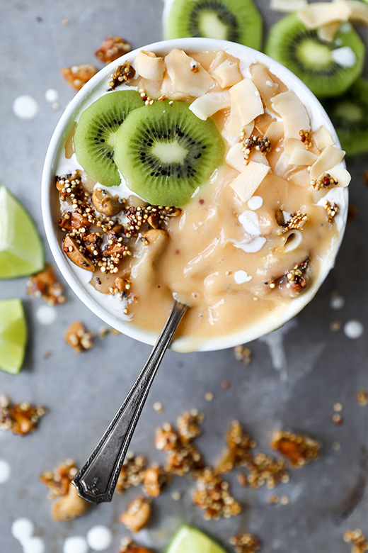 To balance the savory ingredients, I used a super ripe banana and some vanilla-flavored yogurt. I didn’t want this smoothie bowl to be TOO savory. Even I have limits.
