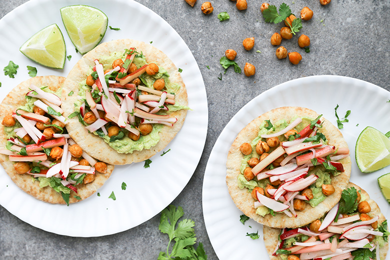 6. To assemble the tostadas, spread some of the guacamole onto the warmed pita breads. Top with the roasted chickpeas and some of the rhubarb-radish slaw. Serve immediately.