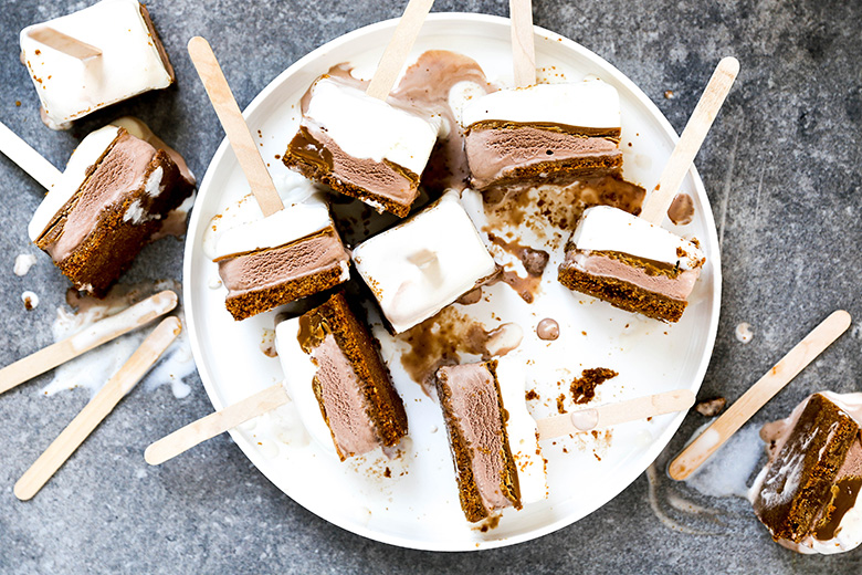 Basically, you (1) press a crust layer into a baking pan, (2) spread your favorite ice cream flavors on top and (3) freeze it. Easy peasy, folks. These babies are totally customizable. You don’t need a popsicle mold. And you can easily scale up to make enough for a Summer party. We’re winning at life today!