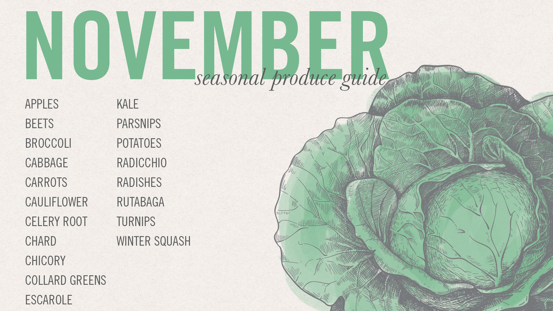 With Thanksgiving fast approaching, I know many of us will be putting in extra hours at the grocery stores and in our kitchens during the next few weeks. So it’s a great time to take a peak at Becky’s seasonal produce guide and graphic for the month of November. Because taking advantage of the fruits and vegetables that are seasonally available is a great way to shop, cook and eat smarter!